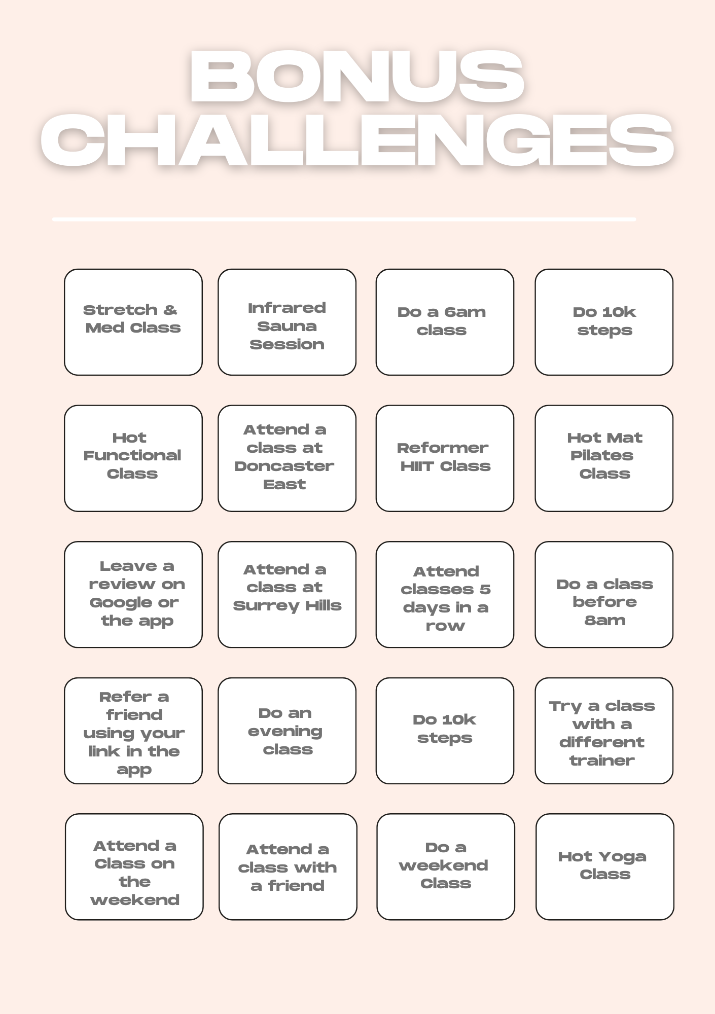 If you do not have enough classes to cover you on your current membership or do not wish to use your current class pack, we have a special challenge pack you can purchase which will cover all your classes (Reformer & Mat) across Surrey Hills and Doncaster East for the duration of the challenge.